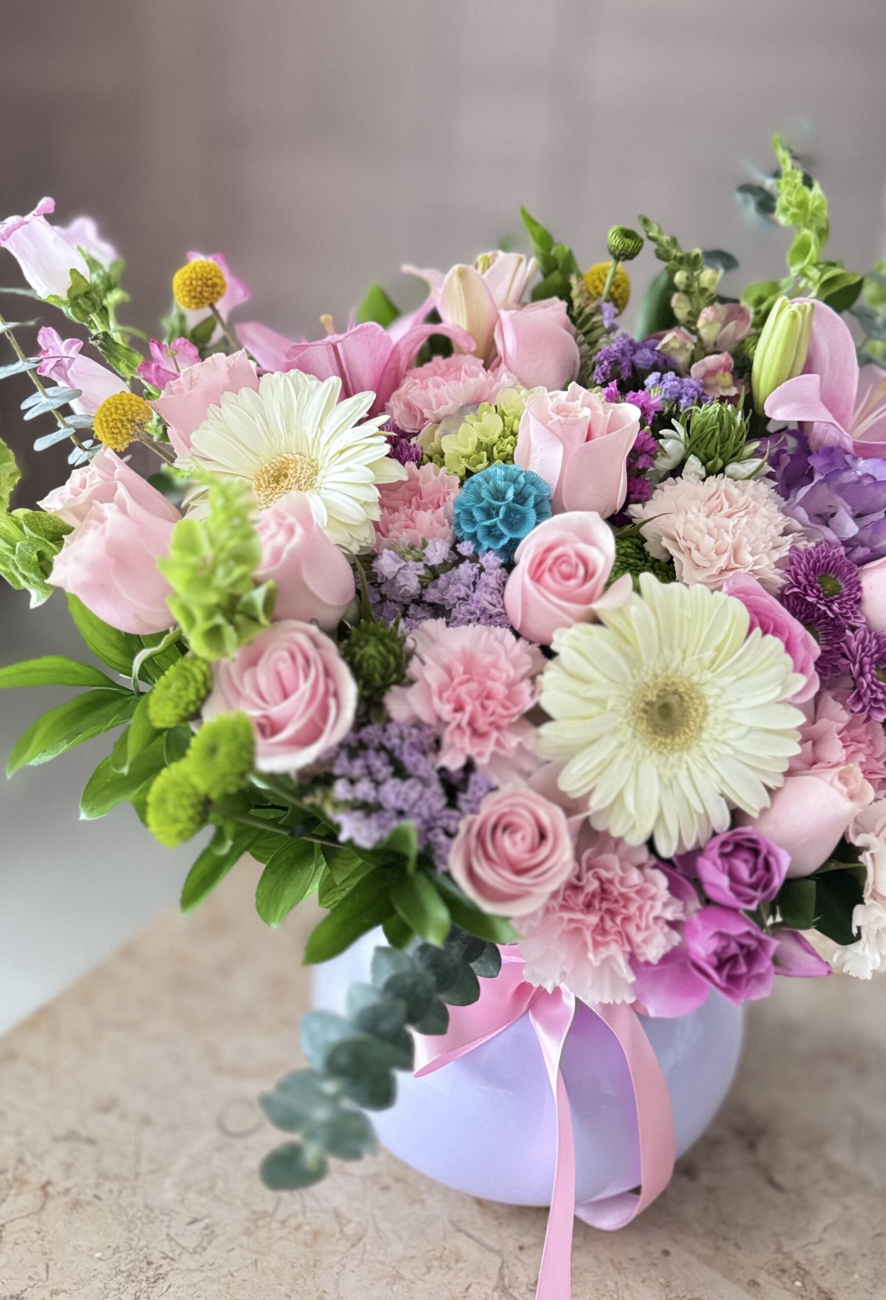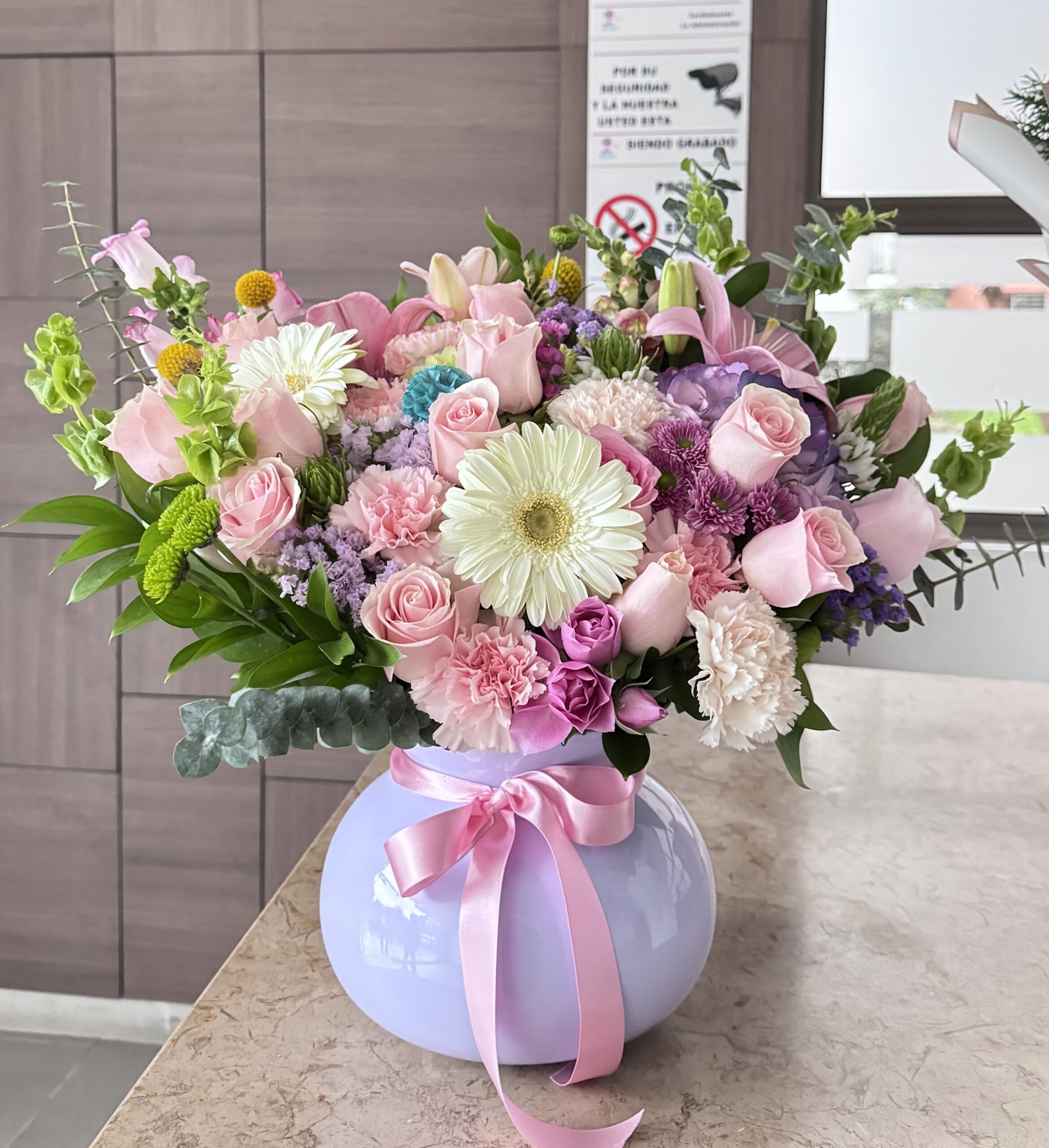 Jarrón lila con flores pastel y lazo rosado, ideal para mamá.Incluye florero